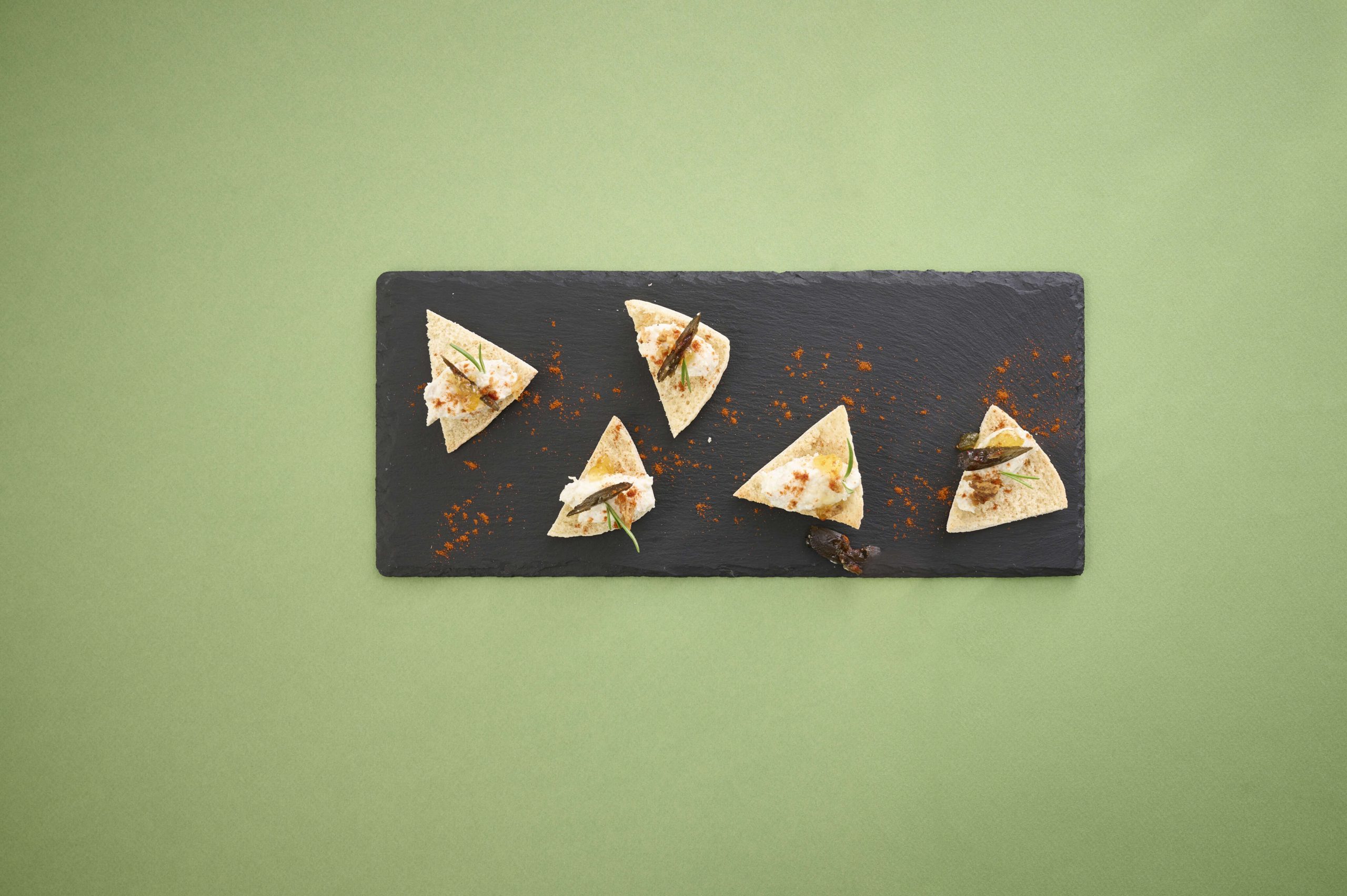 Πικάντικη μους κολοκάσι και αναρής, τραγανή κυπριακή πίτα, καπνιστή λούντζα, μαρμελάδα σύκο