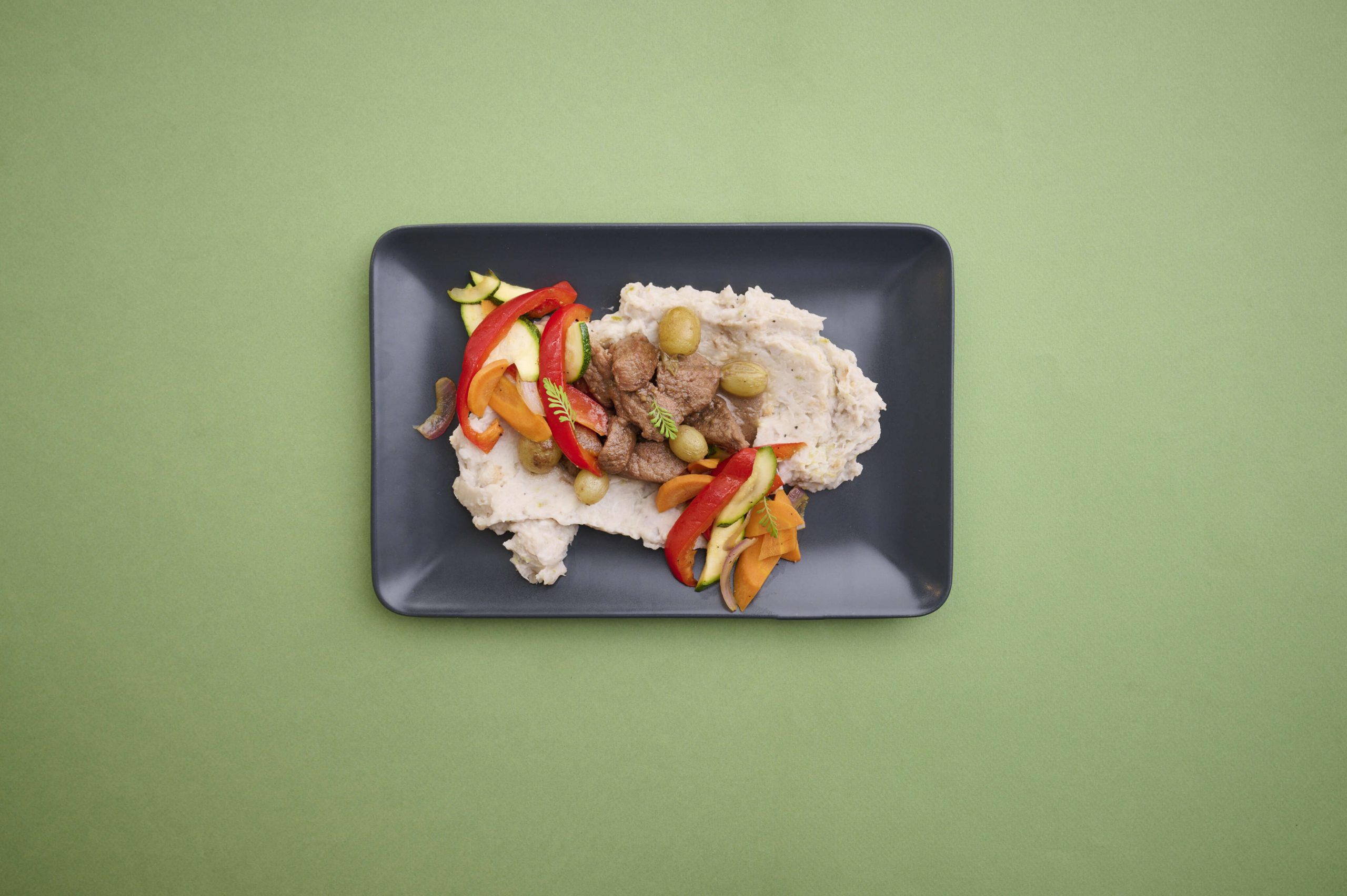 Χοιρινό στιφάδο με σταφύλι, σάλτσα κουμανταρίας, πουρέ από κολοκάσι και λαχανικά εποχής
