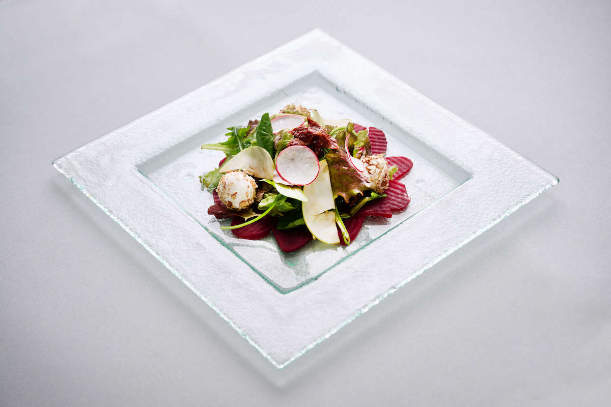 Πράσινη σαλάτα με κατσικίσιο τυρί, πράσινο μήλο, λιαστή ντομάτα και καρύδια